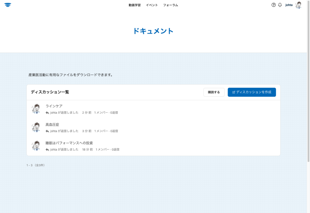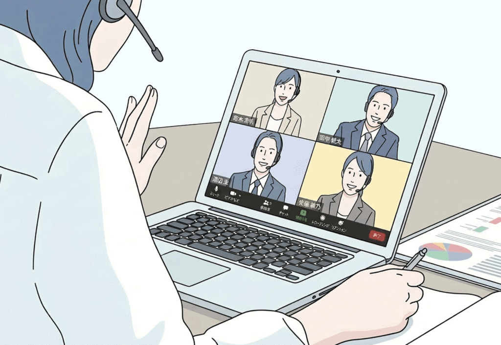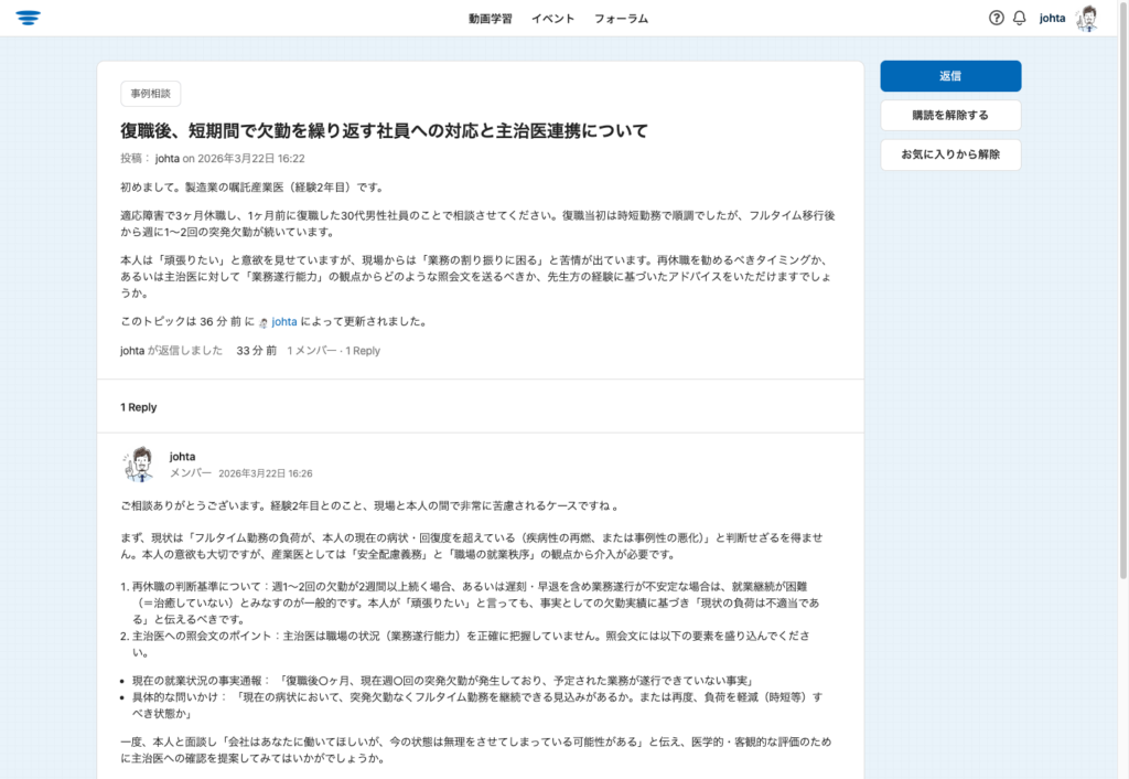 経験豊富な産業医の体験談や事例検討会、産業医同士の交流会をオンラインで定期的に行っています。